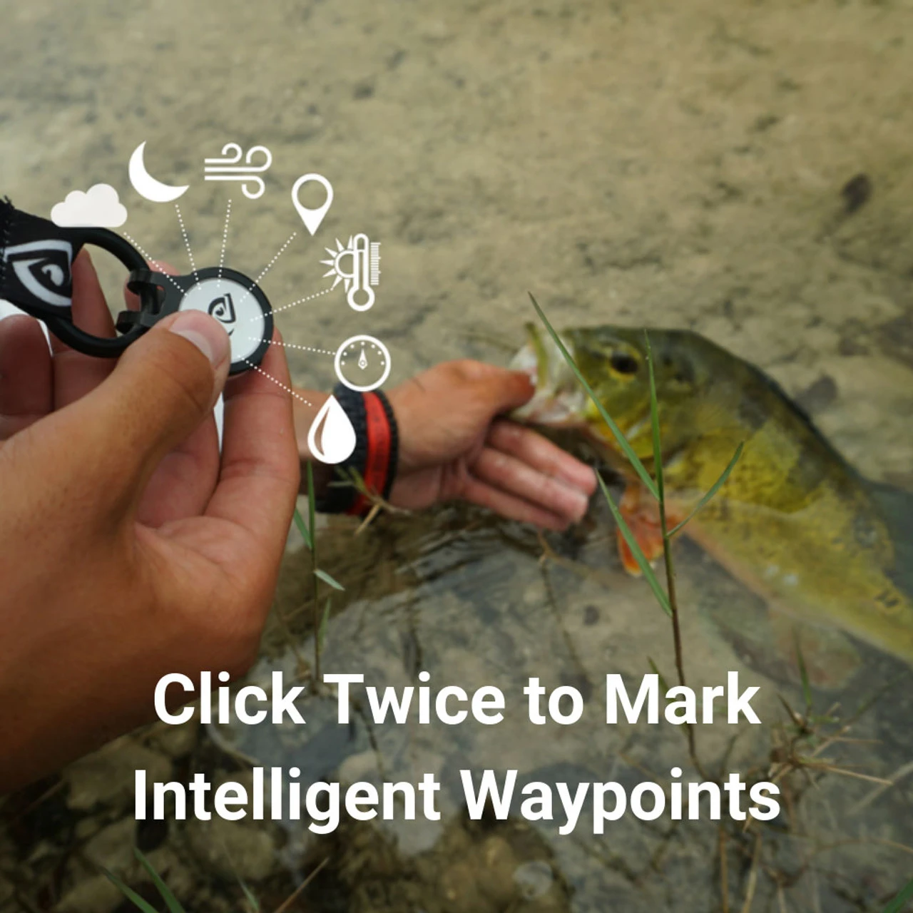 - Click once to record fish catches with weather, water, and location details